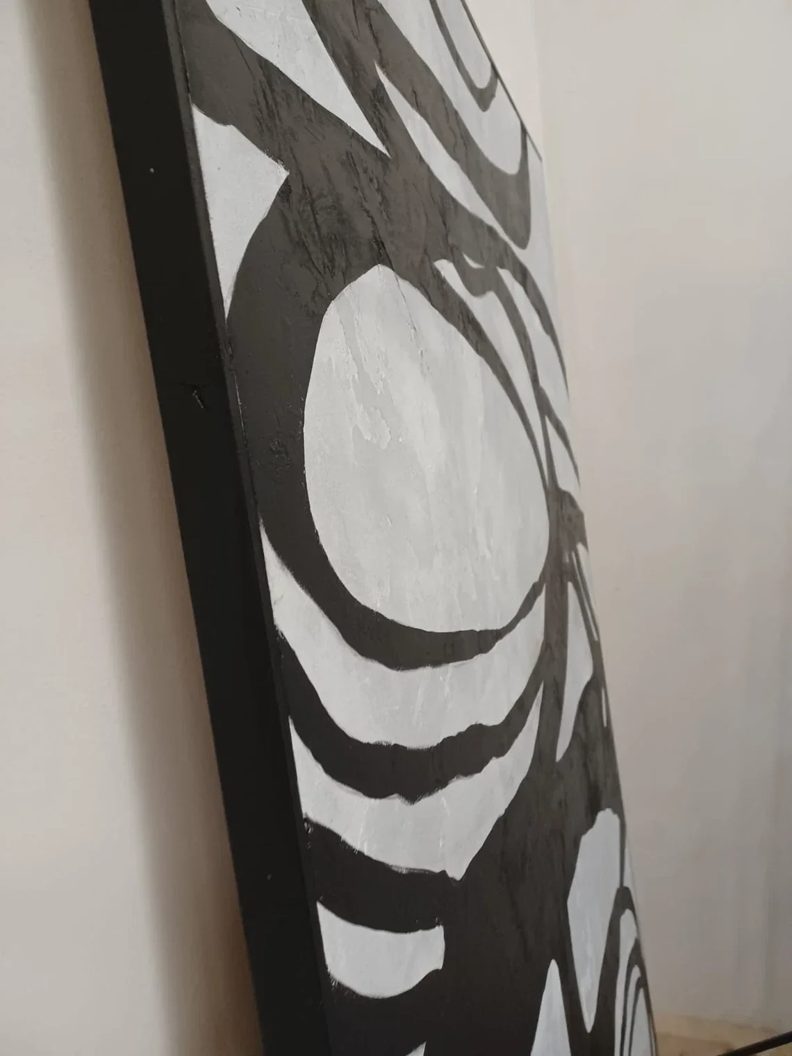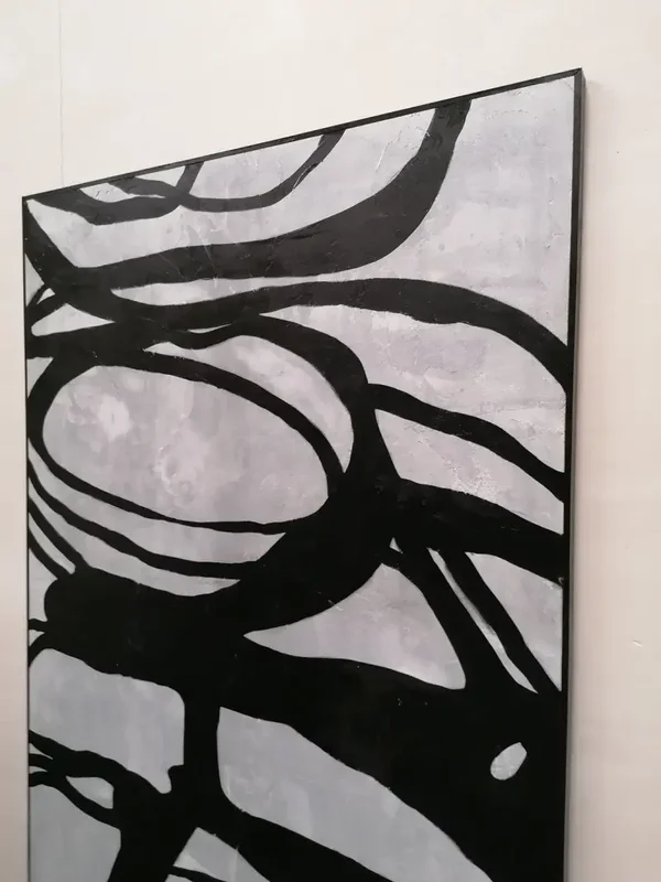 Uniek aan dit kunstwerk is de achtergrond: geen traditioneel doek, maar een stevige plaat bedekt met een dun laagje cement. Hierdoor ontstaat een prachtig, ruw reliëf dat de organische vormen op het oppervlak tot leven brengt. Het spel van diepte, textuur en licht maakt dit werk bijzonder dynamisch en tactiel aantrekkelijk.