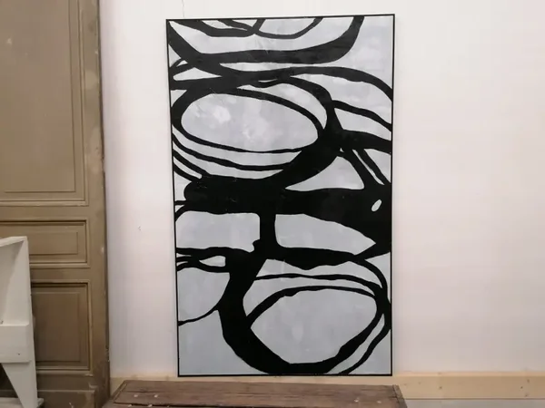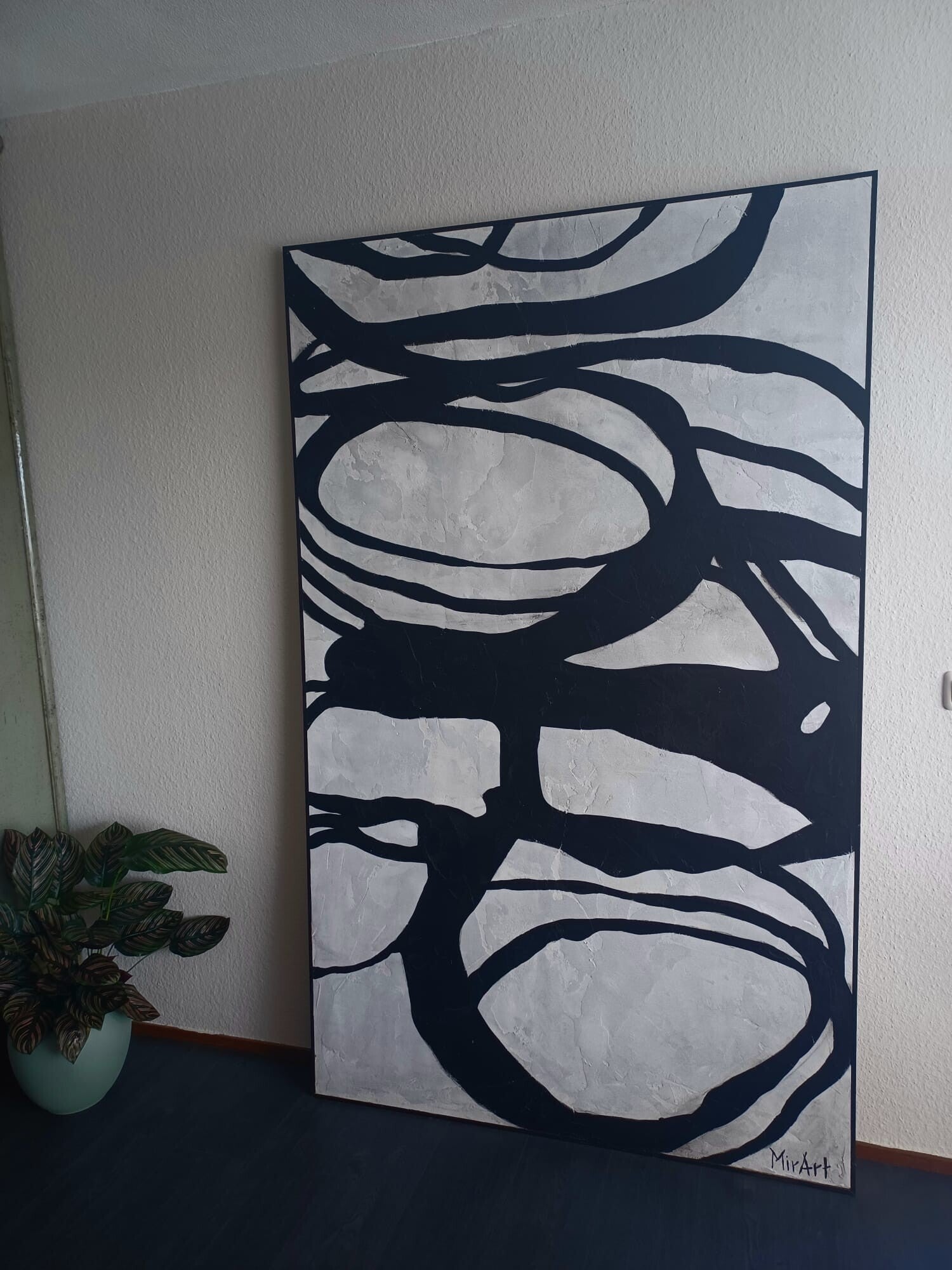 Dit imposante hedendaagse kunstwerk trekt direct de aandacht en is een echte sfeermaker in elk interieur. De combinatie van grote afmetingen, doordachte structuur en expressieve opzet geeft het werk een dominante aanwezigheid, zowel hangend aan de muur als leunend tegen een wand.