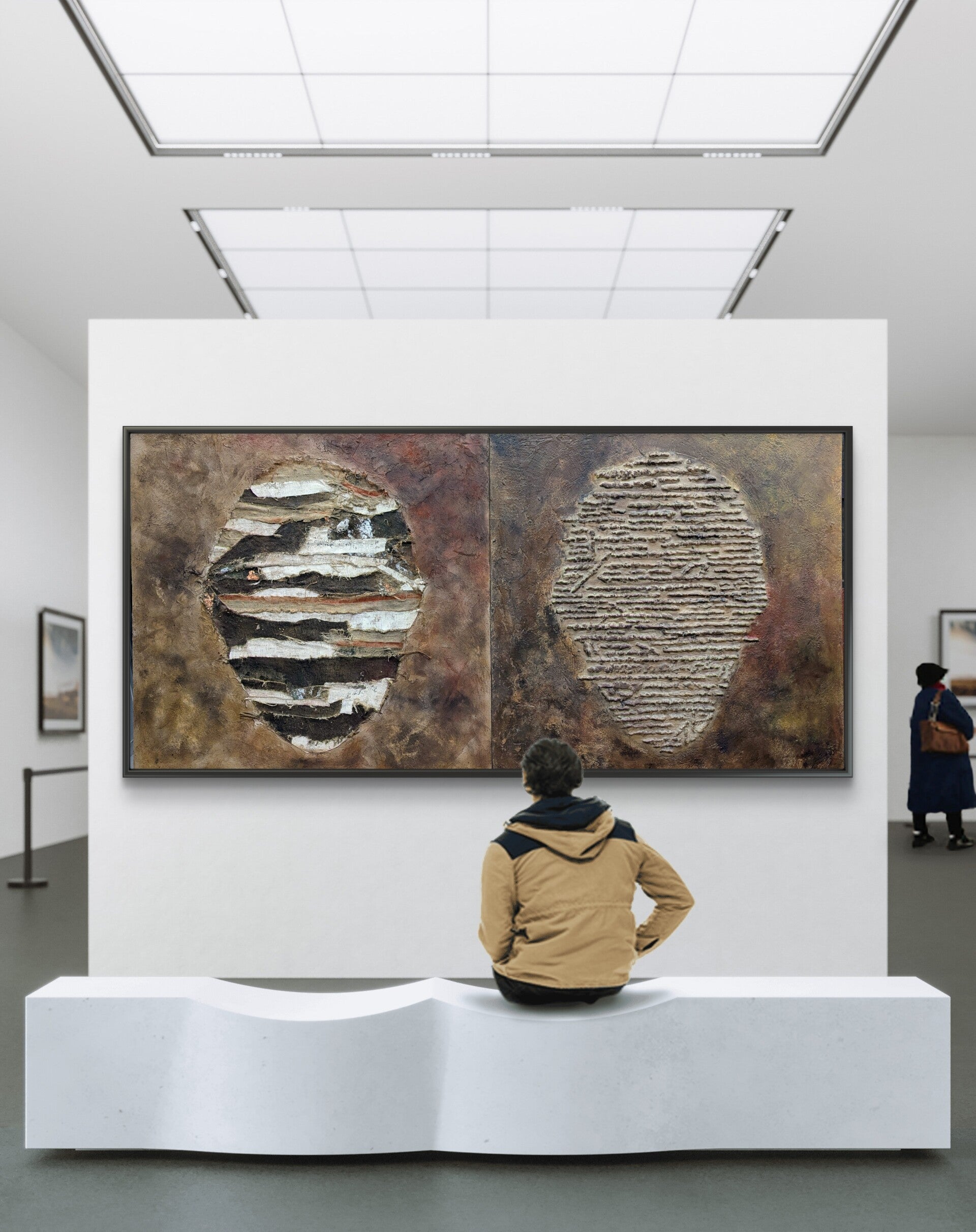 Dankzij de royale formaten zijn het indrukwekkende blikvangers in een hal, woonkamer of moderne leefruimte. De stevige stalen lijst omlijst het werk op krachtige wijze en benadrukt het robuuste, hedendaagse karakter. De werken kunnen afzonderlijk worden opgehangen, maar ze kunnen ook worden geleverd aaneen in één stalen lijst.