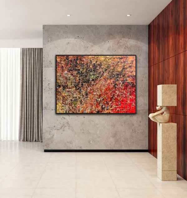De combinatie van de ruwe textuur, het energieke lijnenspel en de warme kleuren geeft het werk een expressieve en levendige uitstraling. Tegelijk roept het een gevoel van tijd en geschiedenis op, alsof verschillende lagen van het oppervlak langzaam zijn blootgelegd. Het resultaat is een abstract kunstwerk dat zowel structuur als beweging uitstraalt en de kijker uitnodigt om steeds nieuwe details te ontdekken.