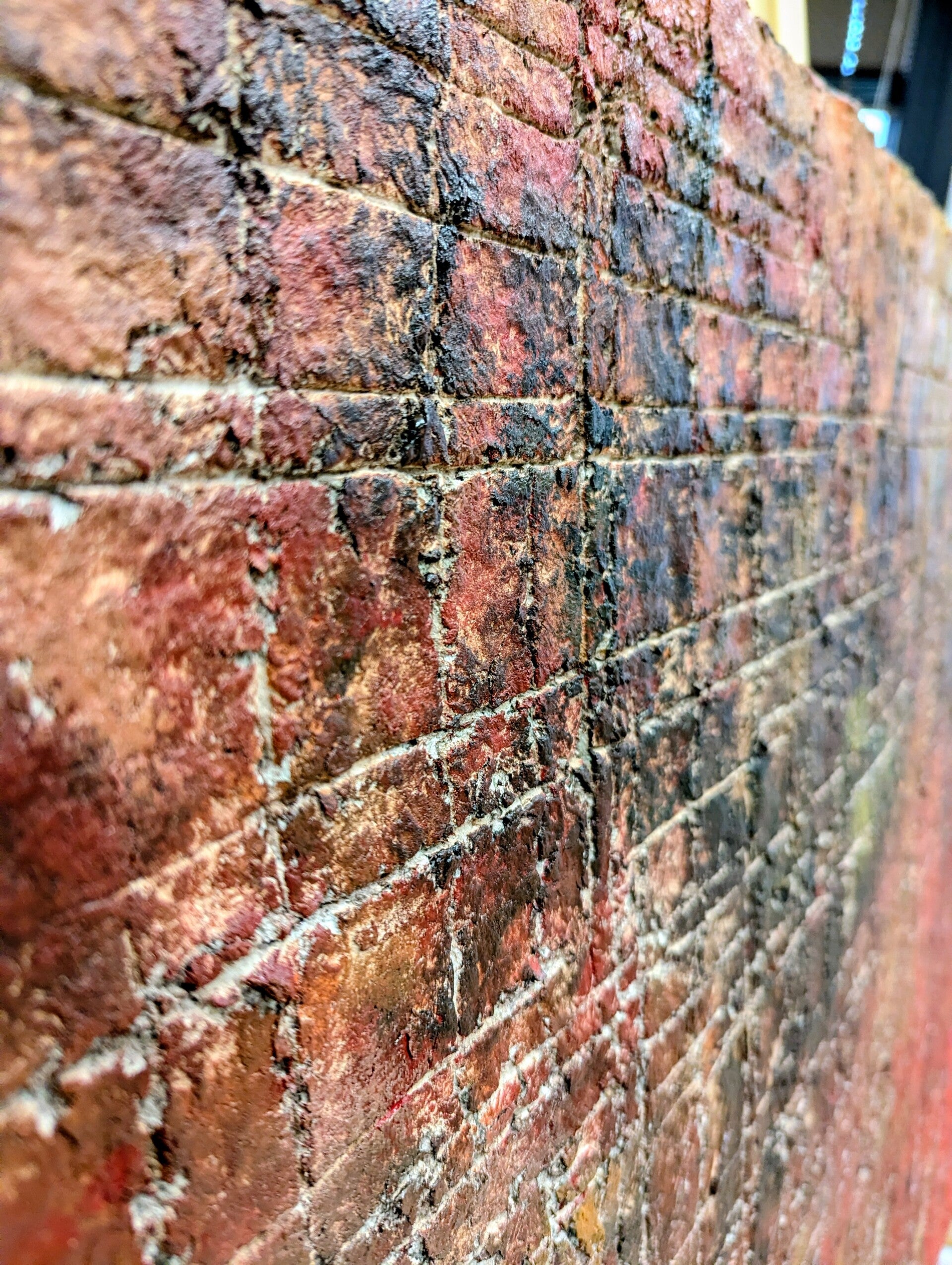 Het kleurgebruik wordt gedomineerd door warme tinten zoals rood, roest, oranje en aardebruin. Deze kleuren lopen in elkaar over en creëren een rijk palet dat aan verweerde baksteen, oxidatie of natuurlijke erosie doet denken. Tussen de warme tinten verschijnen donkere accenten en lichtere, bijna kalkachtige lijnen, die het contrast versterken en het lijnenspel extra laten opvallen.